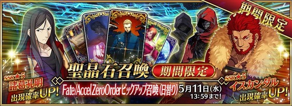 『Fate/Grand Order』「Fate/Accel Zero Order」詳細公開!期間限定召喚に☆5「イスカンダル」が登場、☆4「エミヤ〔アサシン〕」☆3「百の貌のハサン」も新登場